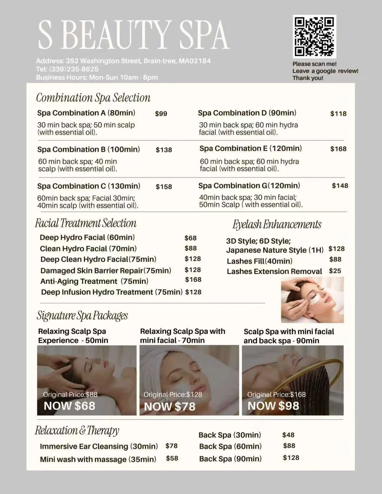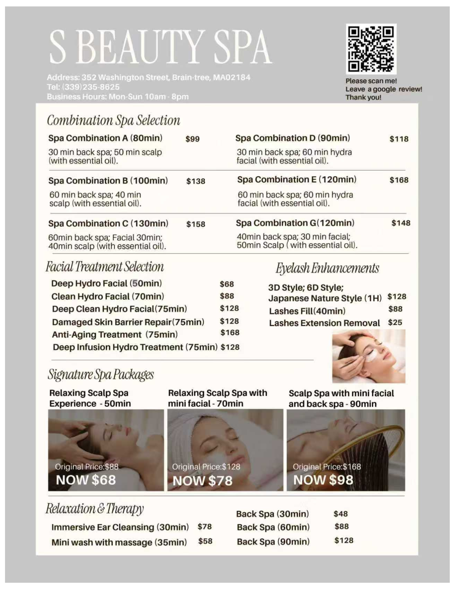 $78/70 minutes - Deep Relaxation Experience: This extended version incorporates essential oil scalp treatment, which not only promotes relaxation but also nourishes the scalp and hair. The longer session provides deeper relaxation, making it perfect for clients looking for both mental and physical rejuvenation.